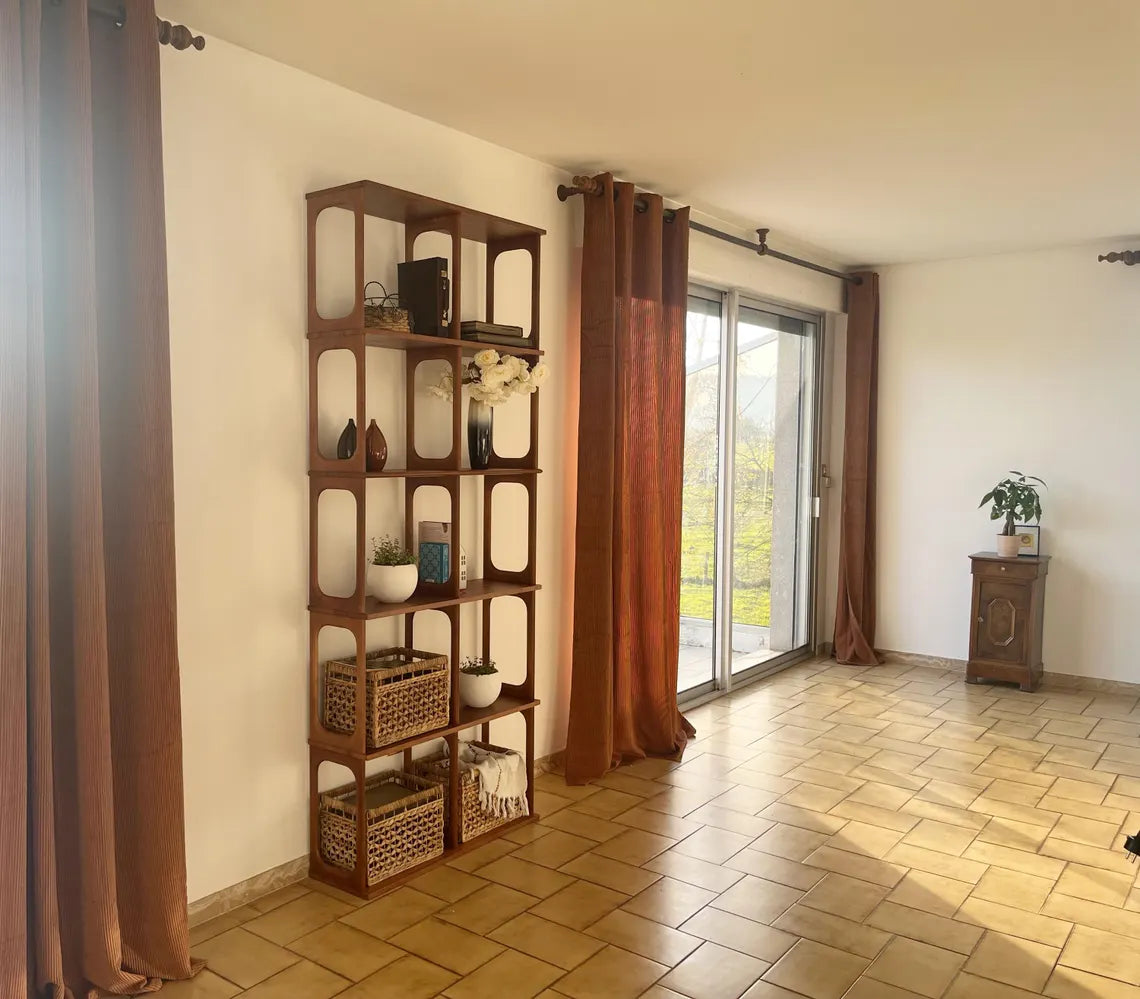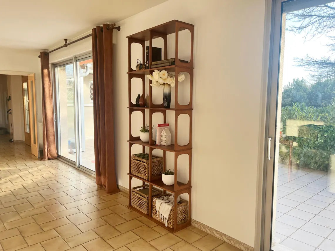 Bring timeless design into your home with this handcrafted mid-century modern shelf. Made from high-quality wood and finished in warm, natural tones, this shelving unit is both stylish and functional. Its clean lines and geometric structure make it the perfect statement piece for a living room, office, dining area, or entryway.